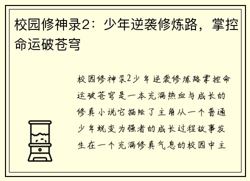校园修神录2:少年逆袭修炼路,掌控命运破苍穹