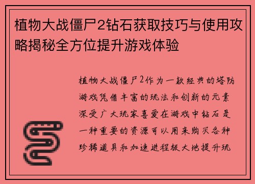 植物大战僵尸2钻石获取技巧与使用攻略揭秘全方位提升游戏体验
